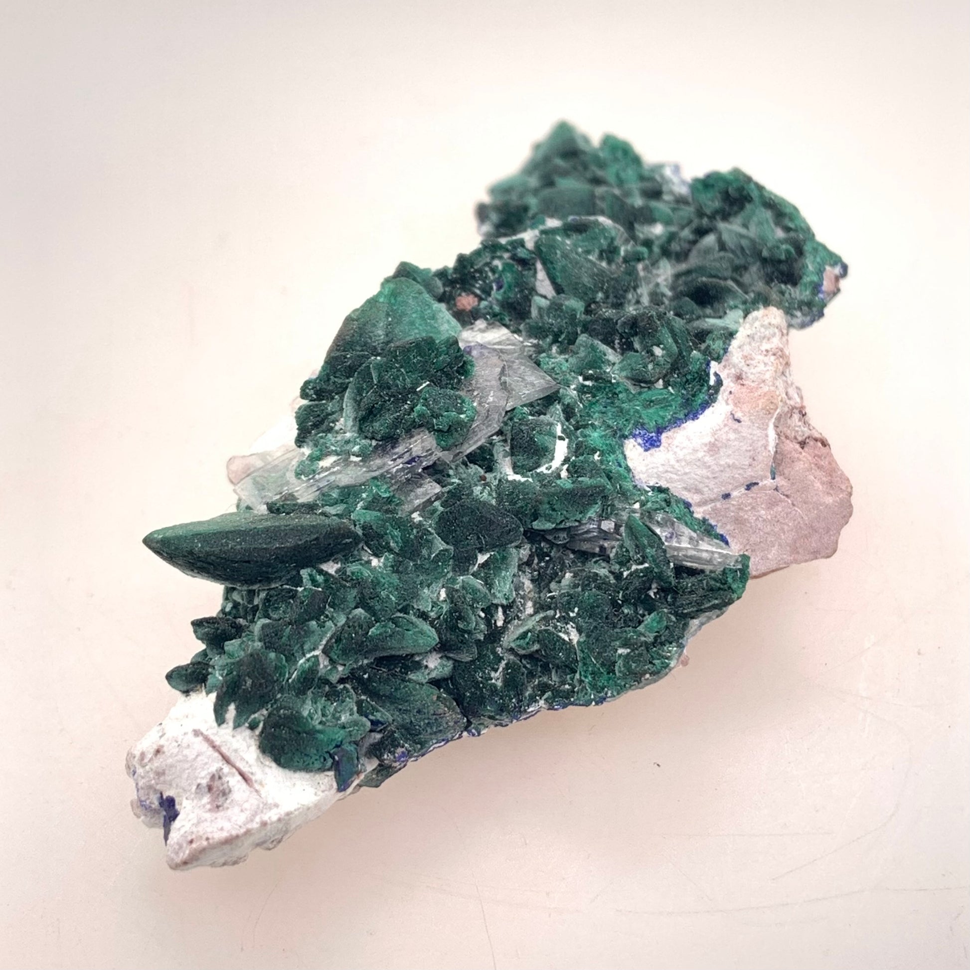 Malachite Pseudomorph after Azurite from the Milpillas Mine in Sonora, Mexico, is an extraordinary mineral specimen showcasing the remarkable process of pseudomorphism. In this specimen, Malachite has replaced Azurite, retaining the original crystal shape of Azurite while adopting the vivid green hues and properties of Malachite. This unique transformation results in a specimen that is both visually stunning and geologically intriguing, reflecting the dynamic nature of mineral formation.